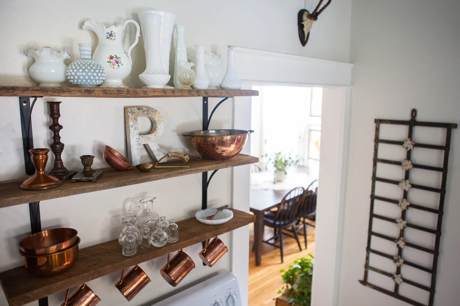 I also love collecting vases and copper. I've acquired these vintage pieces over time from antique malls, flea markets, garage sales etc. (The mugs are from Beam and Anchor in Portland) I display my collection on old barn wood shelves in my kitchen.