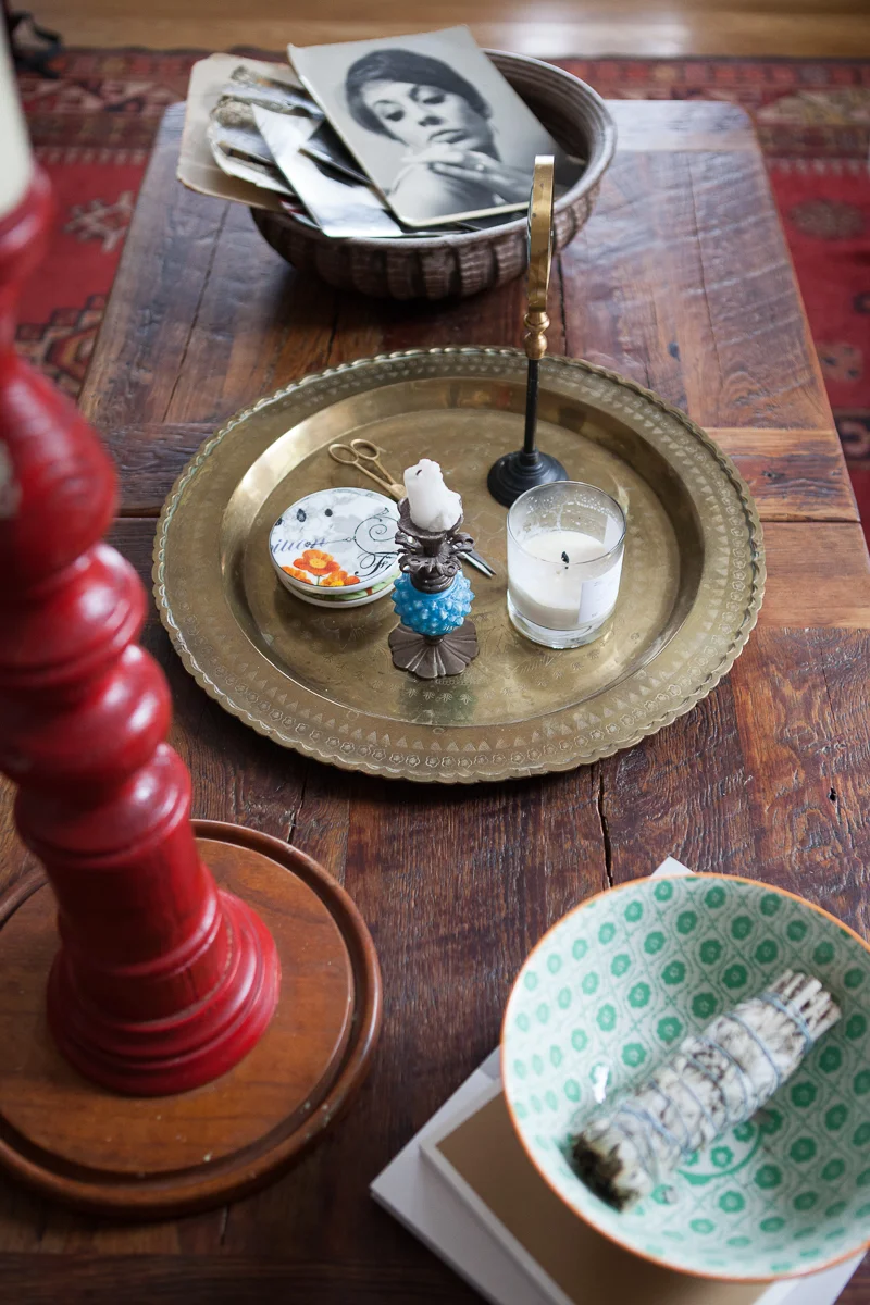 This coffee table was one of the last gifts my papa gave me before he passed. He had it made for me with wood from an abandoned shack in Louisiana, my home state. The bowl is filled to the brim with old pictures of people and moments I love. That's my beautiful mama on the top. People are more likely to flip through photos when they are sitting out. I also love having yummy smelling candles burning in my home at all times. One of my favorite candles was made by a dear friend, Travis, who owns Manready Mercantile.