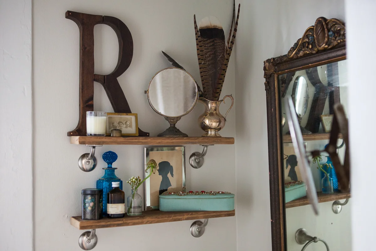 The restroom can be beautiful and functional. I try to decorate with pieces that have a story and mean something to me. Every item on these shelves tells a story. The R was a house warming gift from my precious friend, James, of Handy Andy Productions. Since I love giving and receiving personalized gifts, this letter meant so much to me. I love my wooden initial! James finished it off with copper nails because he knows how much I like copper!