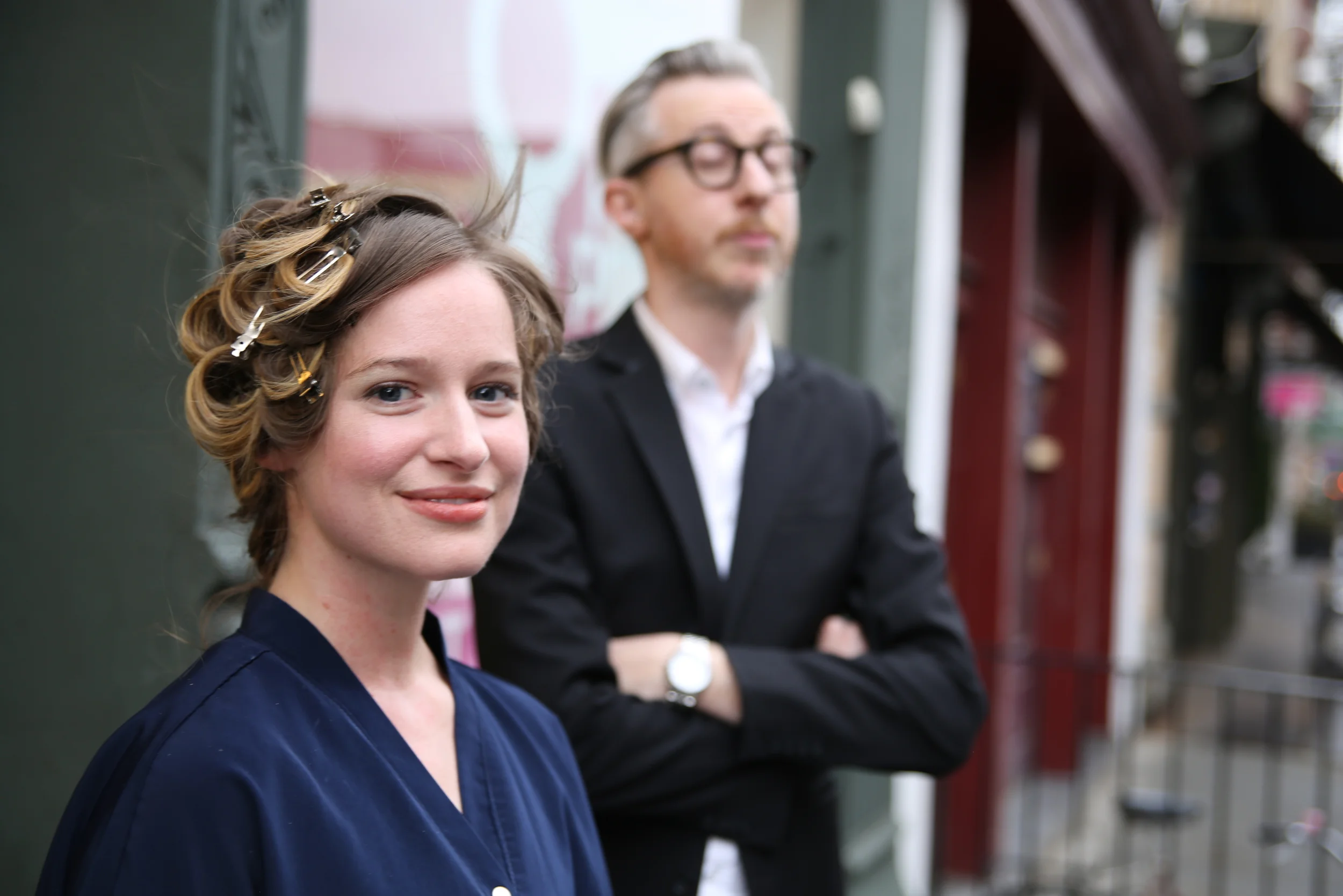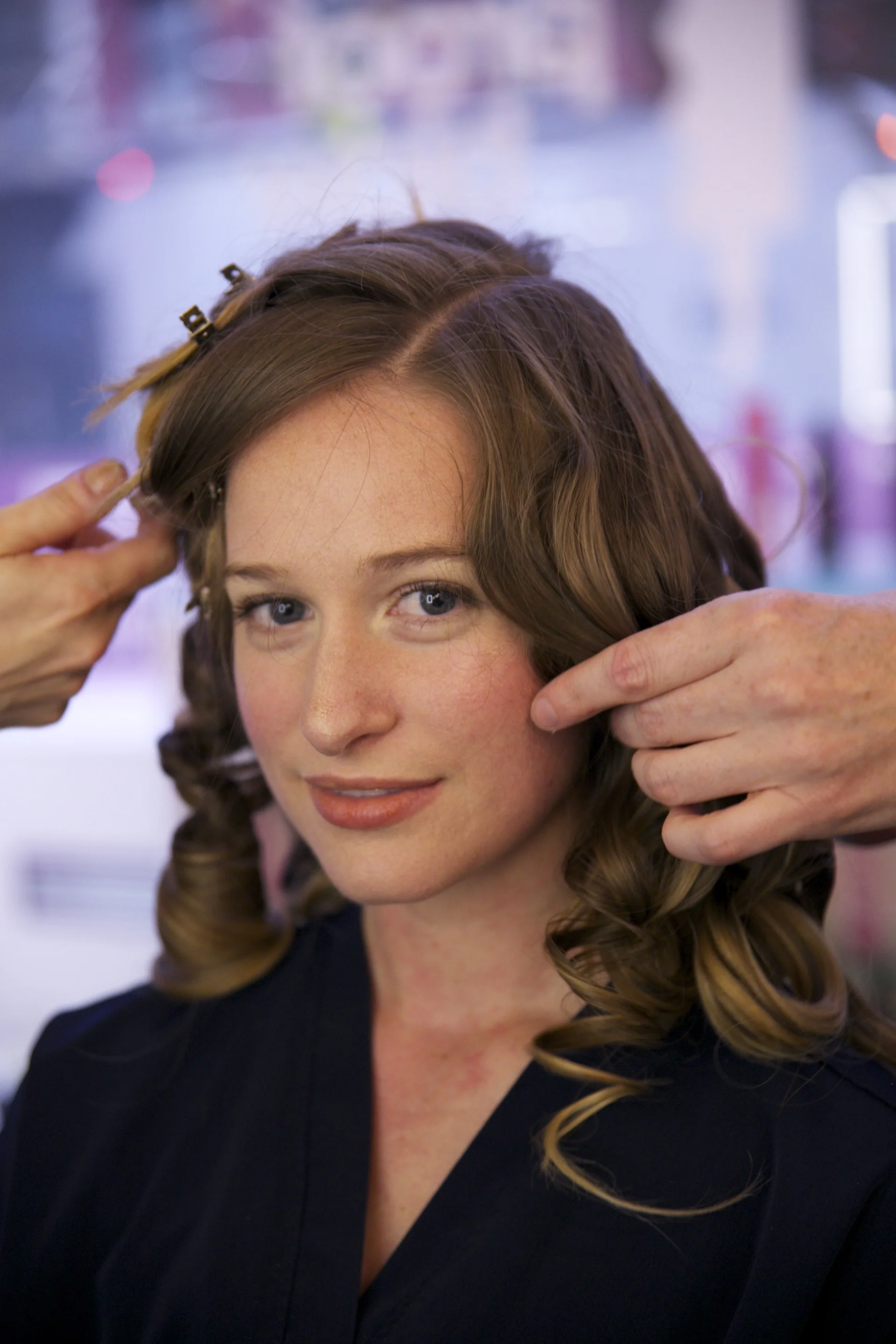 After he completed all of my hair with this process, we took a few minutes to chill + let my pin curls do the same. He then pulled out the pins to reveal a whole head of springy Shirley Temple-esque curls!